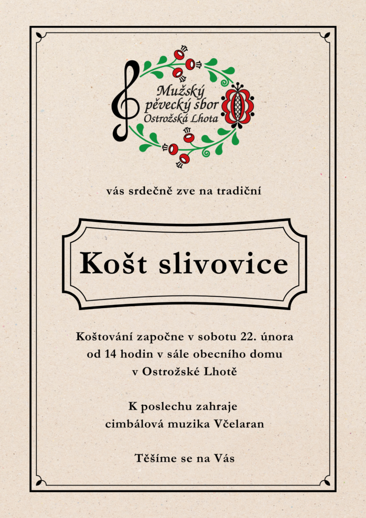 Mužský pěvecký sbor Ostrožská Lhota zve na Košt slivovice, který se bude konat v sobotu 22. února v Ostrožské Lhotě.