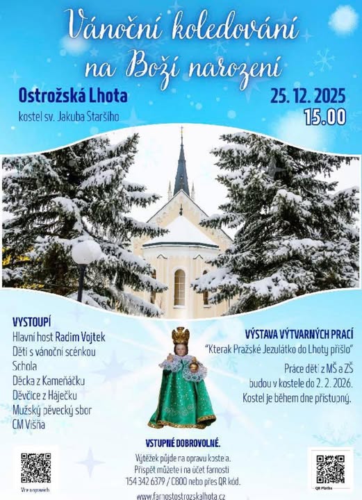 Přijďte s námi oslavit Boží narození do krásného prostředí kostela sv. Jakuba Staršího v Ostrožské Lhotě. Společně si zazpíváme koledy, užijeme si sváteční atmosféru a podpoříme dobrou věc ❤️