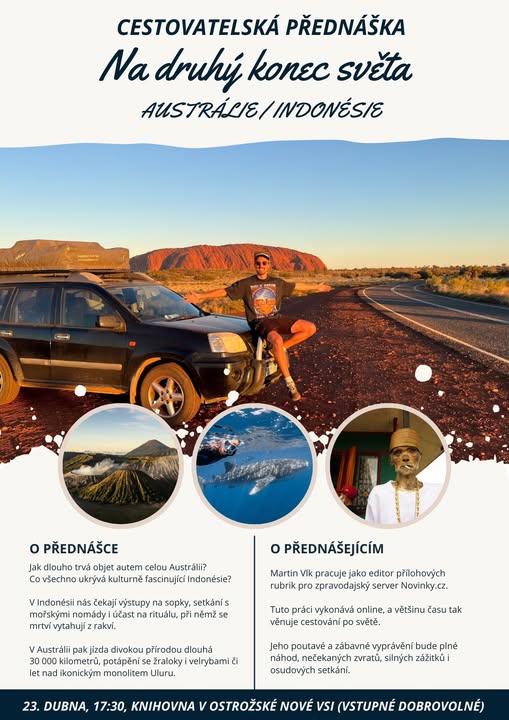 Srdečně vás zveme na dobrodružné vyprávění Martina Vlka, který se podělí o své zážitky z nejdelší cesty po Indonésie a Austrálie ✈️.